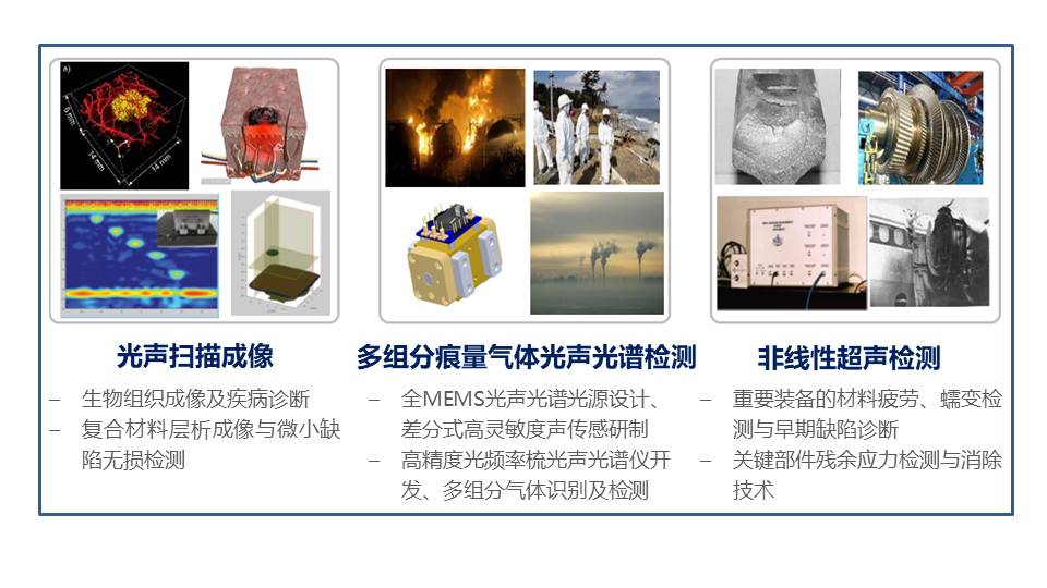 微纳声学器件与光声检测实验室面向国家重大战略需求,开展如下相关研究工作:微纳传感器件设计与关键材料制备,基于多物理场的无损检测新技术研究。目前本实验室承担国家自然科学基金项目、国家重点研发计划项目3项、承担国家十三五电子信息专项2项,科技委员会创新项目3项,项目组成员发表包括Nature Communications, Physical Review X/Letters/Applied/B., Advanced Functional Materials等SCI学术论文150余篇。授权美国专利1项,授权中国发明专利20余项。